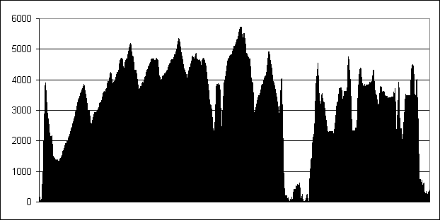 Cuzca do Limy. Autobus během 24 hodin nastoupal celkem 7,5 km a sestoupal 10,5 km. Včetně 3hodinové přestávky
