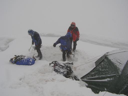 15. 8. +835, -5, postup po moréně a po ledovci, je mlha a sněží, tábor mezi trhlinami