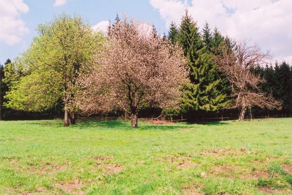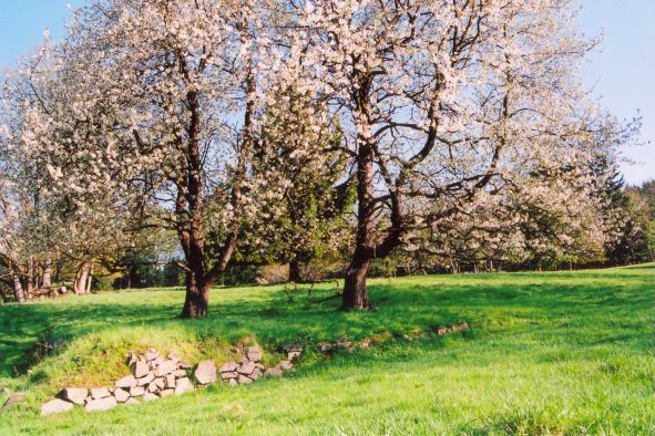 Snídám celozrnný žitný chléb, eidam a česnek. Balím stan a padám dál. Kolem kvetou zdivočelé ovocné stromy.
